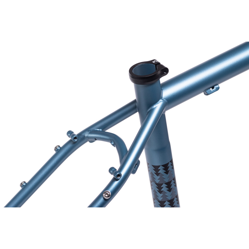 Top tube bag direct mounts, triple cage mounts on both seat stays, underneath and on top of the down tube, double cage mounts on the seat tube.