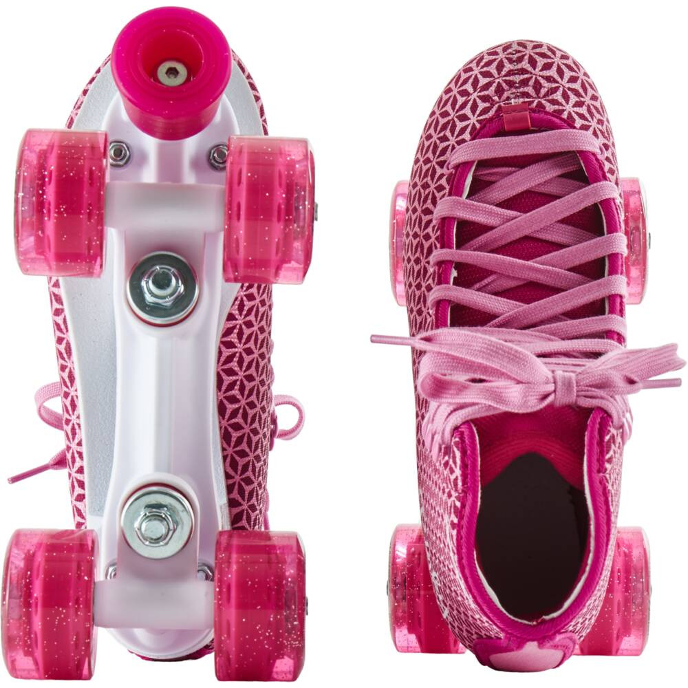 Tempish bringt viel Pink und Glanz in Ihre Sommer-Skate-Sessions, da der Eiskunstlauf-Stiefel mit glitzernden Rädern auf einem weißen Paar Teller kombiniert ist. Perfekte Einstiegs-Rollschuhe für jeden Anfänger oder für Sie, die wieder mit dem Skaten beginnen.