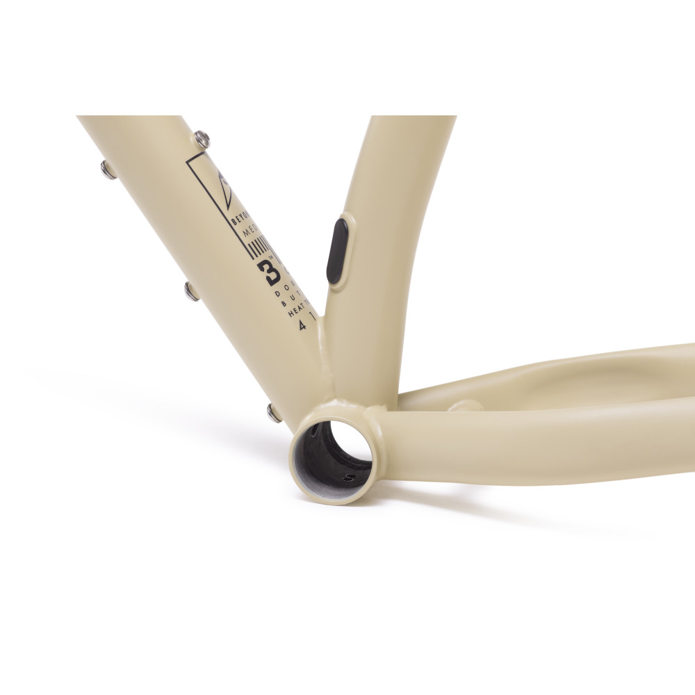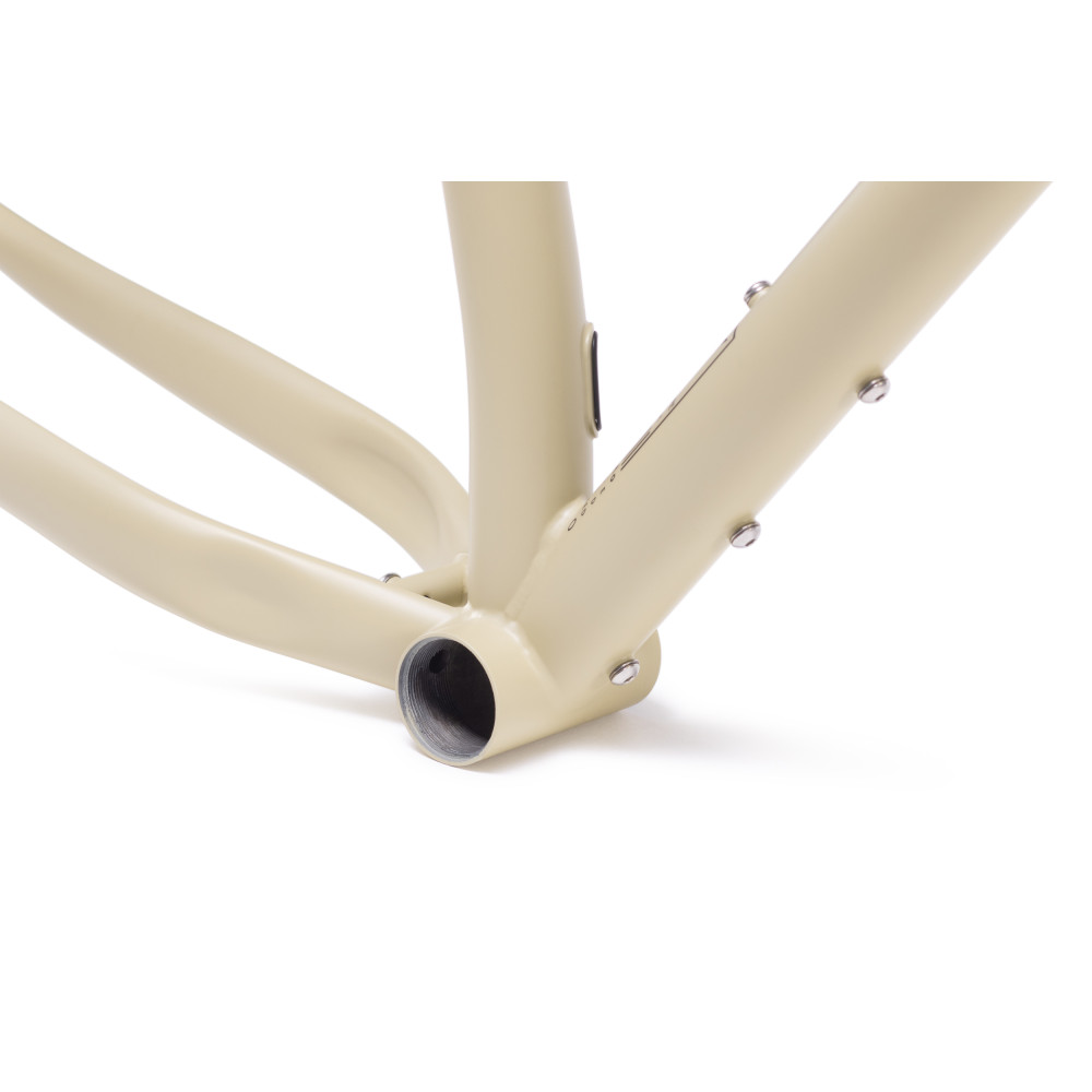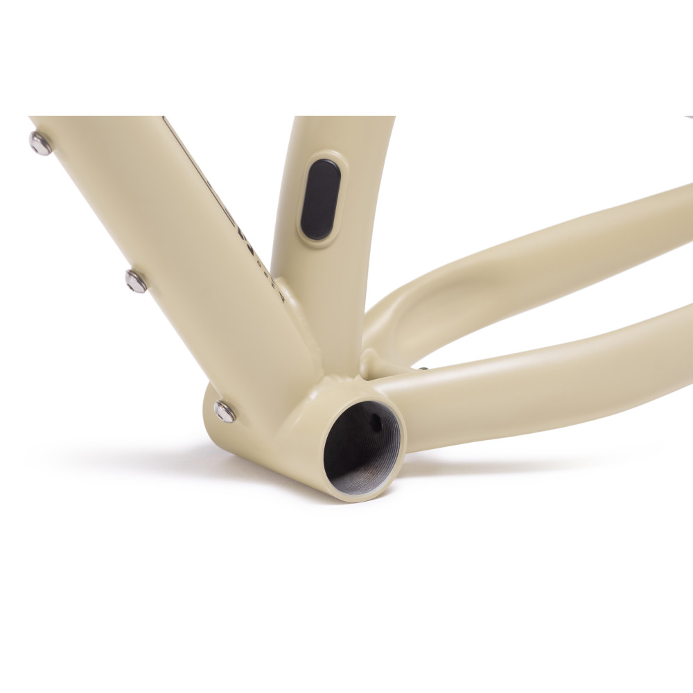 Double butted suspension corrected crmo frame with rack and fender mounts and BSA bottom bracket.